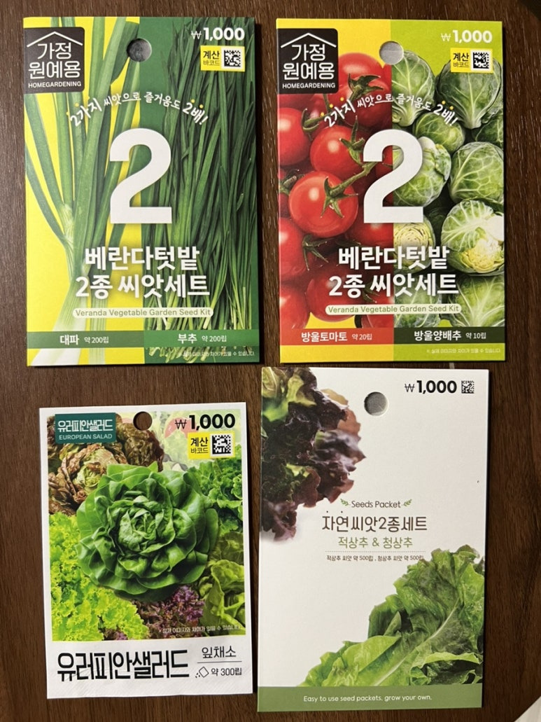 베란다 텃밭 2종 씨앗 세트로 대파, 부추, 방울토마토, 방울양배추, 유러피안샐러드, 적상추, 청상추를 데려왔다.